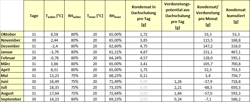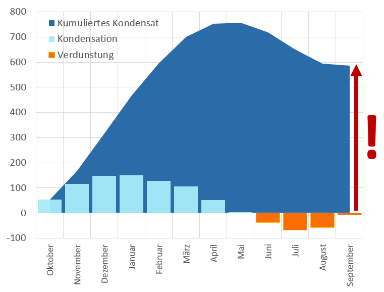 Die dadurch über den Winter kumulierte Kondensatmenge ist jedenfalls problematisch, da die Rücktrocknung einer derartigen Dachkonstruktion nur unzureichend möglich ist. Wie in der Abbildung unten zu sehen ist, erfolgt die Rücktrocknung vorwiegend wieder über das Mauerwerk. In der Verdunstungsperiode sind die in der Berechnung anzusetzenden Monatsmittelwerte der Außentemperaturen nur wenig höher als die Raumlufttemperaturen . Dadurch ergibt sich in Kombination mit der erhöhten Innenluftfeuchte in diesem Zeitraum eine geringe Differenz des Wasserdampfpartialdrucks zwischen Dachhaut und Innenraum und damit ein sehr geringes Trocknungspotenzial. Durch die ungünstige Anordnung tritt nur in vier Monaten des Jahres Verdunstung auf. Eine vollständige Rücktrocknung ist in diesen daher nicht möglich. Es ist mit Feuchteanreicherung und Folgeschäden zu rechnen.