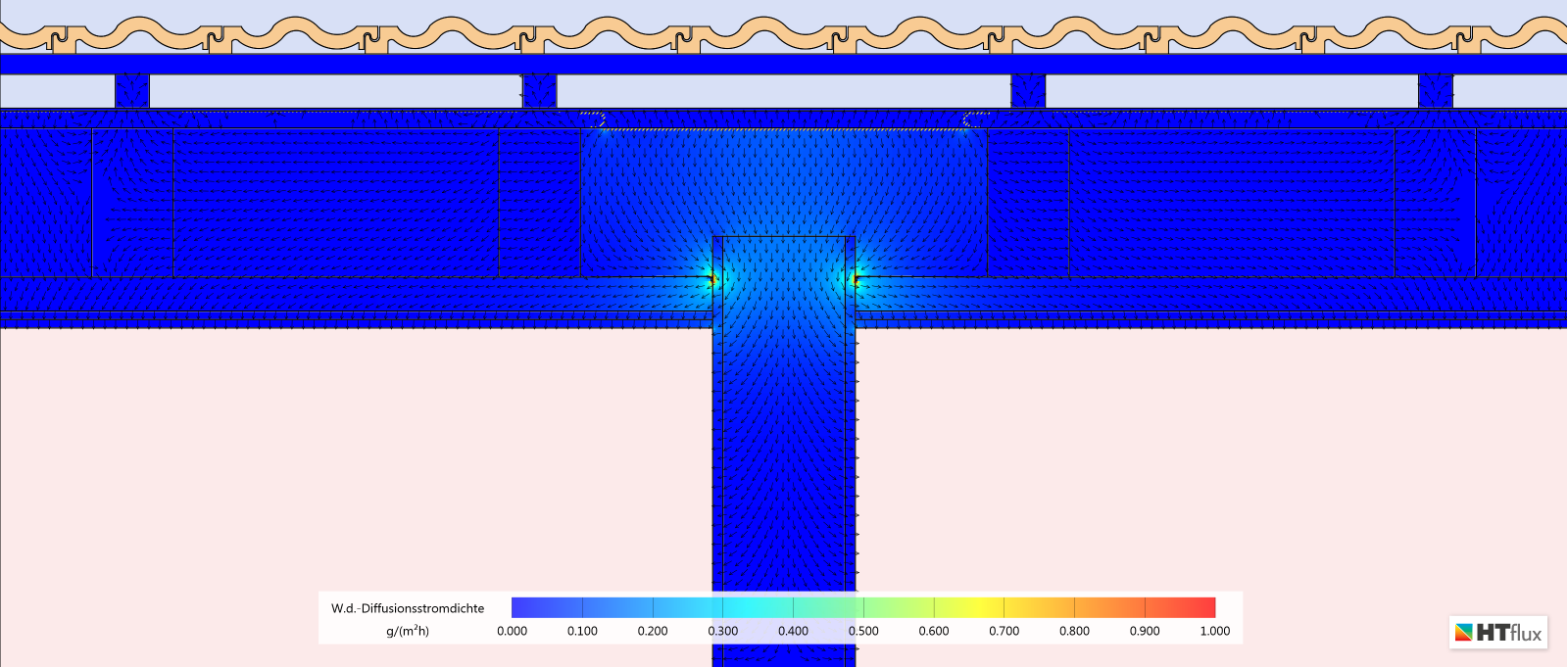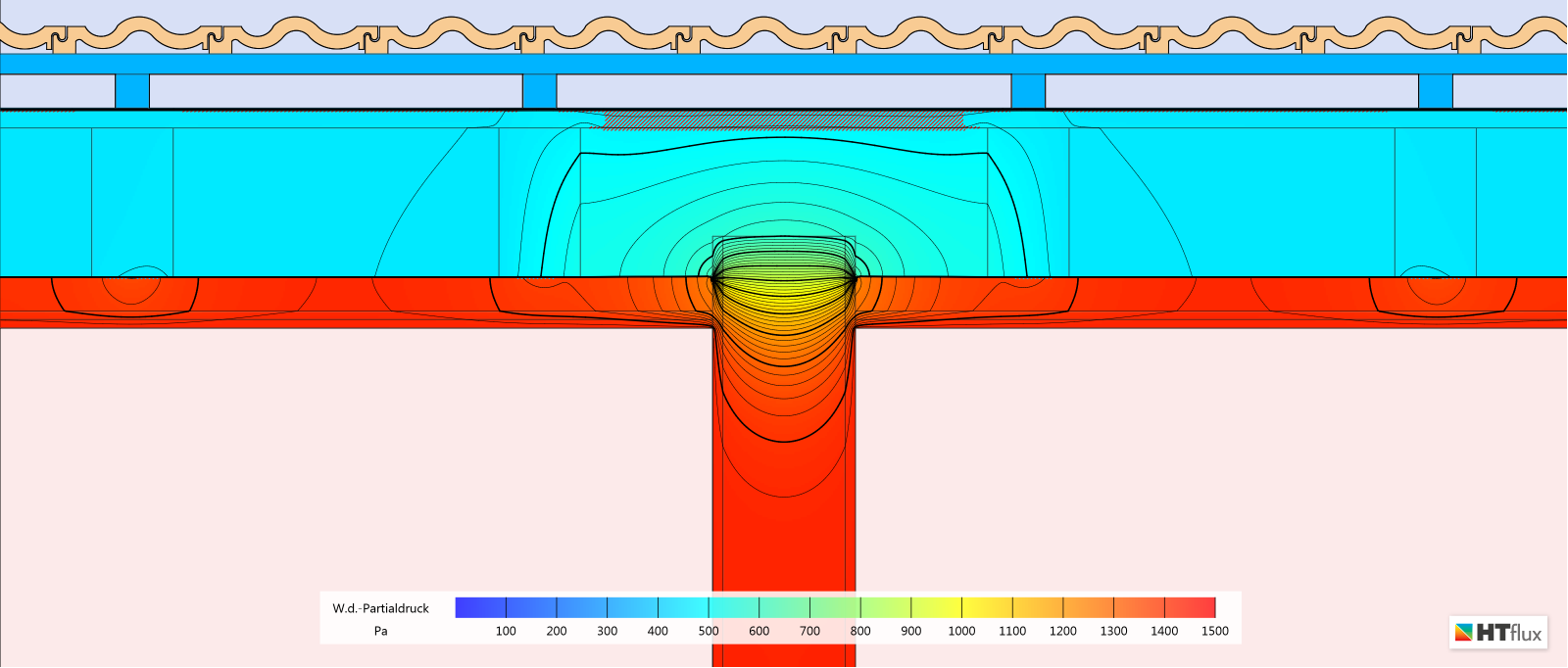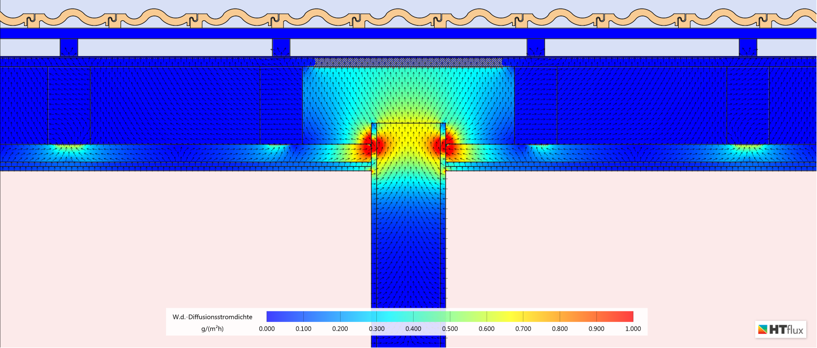 Im vorliegenden Beispiel wird der Effekt der Flankendiffusion in Verbindung mit einem diffusionstechnisch kritischen Dachaufbau untersucht. Als Flankendiffusion kann man jenen Vorgang bezeichnet, bei welchem Wasserdampf durch ein angrenzendes Bauteil die Dampfsperre umgeht.