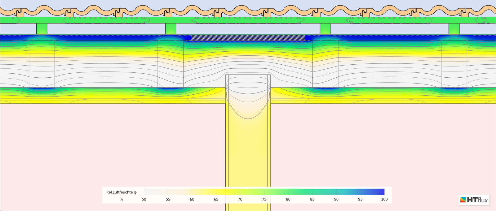Obwohl der vorliegende Aufbau mit diffusionsdichter Unterdeckbahn bei Vollsparrendämmung laut Norm nicht zulässig ist, kommen derartige Dachaufbauten gelegentlich vor. In der Untersuchung mit HTflux kann sehr anschaulich gezeigt werden, warum dieser Aufbau problematisch ist.