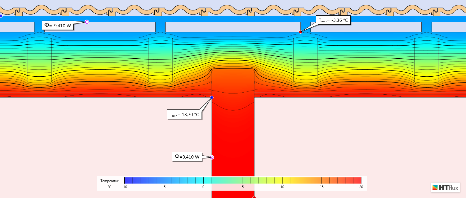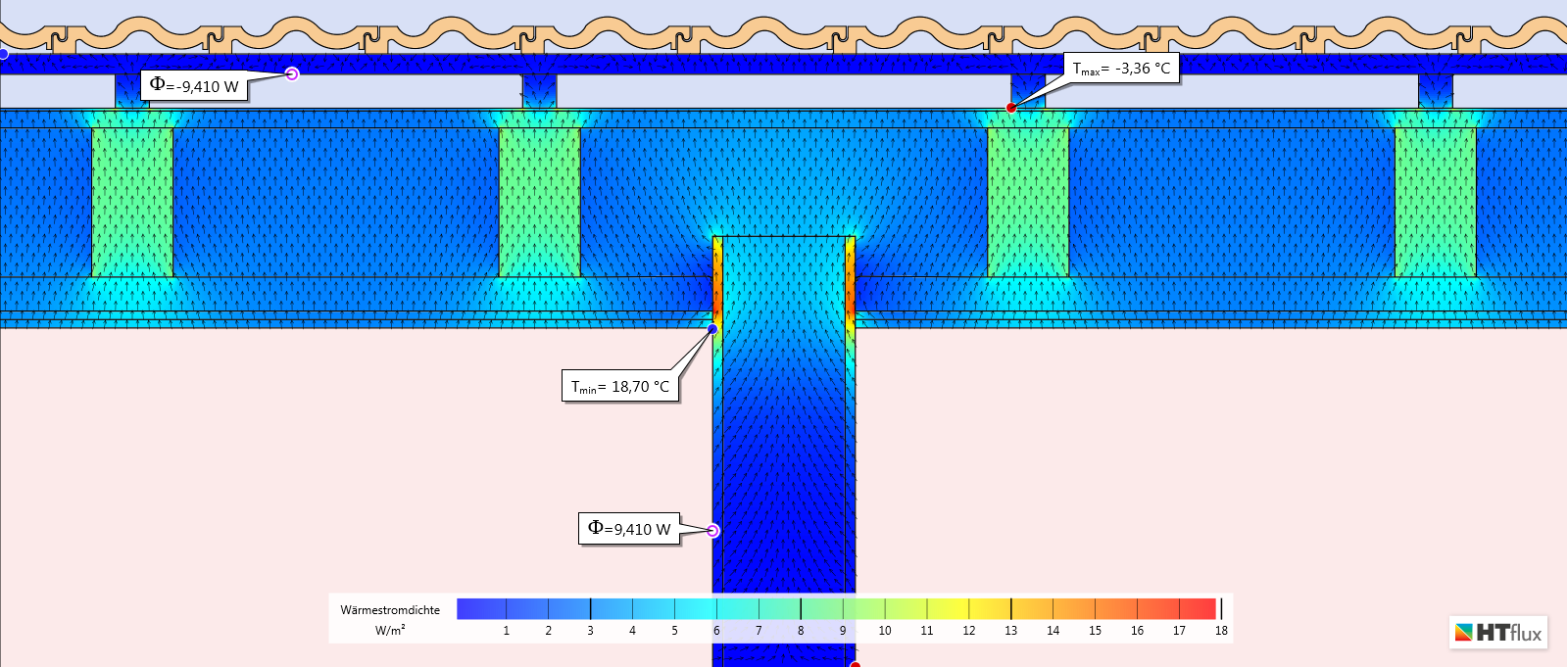• HTflux zeigt, dass bei entsprechend niedrigen Außentemperaturen eine Kondensatbildung innerhalb der Dampfbremse auftritt. Diese entsteht als Folge der Wärmebrückenbildung durch die Sparren in Kombination mit der zusätzlichen Dämmebene unterhalb der Dampfbremse.