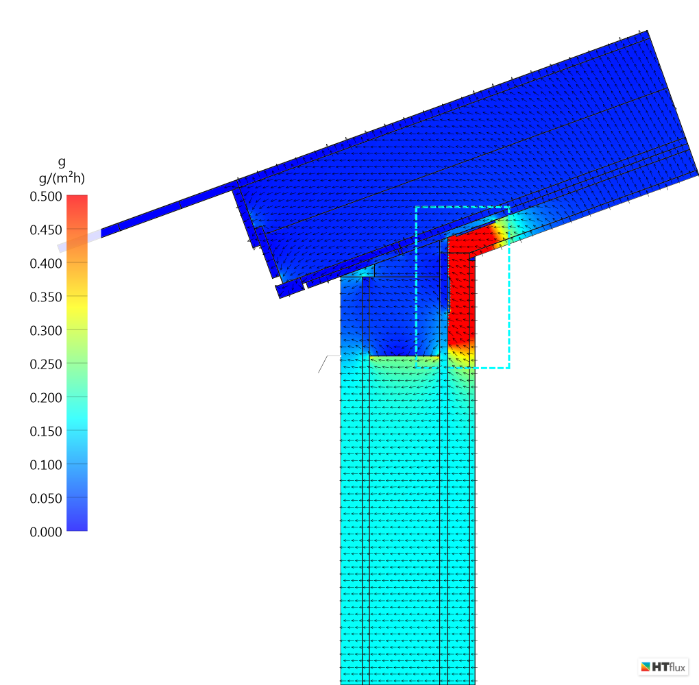 Feuchteansicht – Glaser 2d – Kondensationsbereich im Dachanschlussbereich der Holzriegelkonstruktion innen.