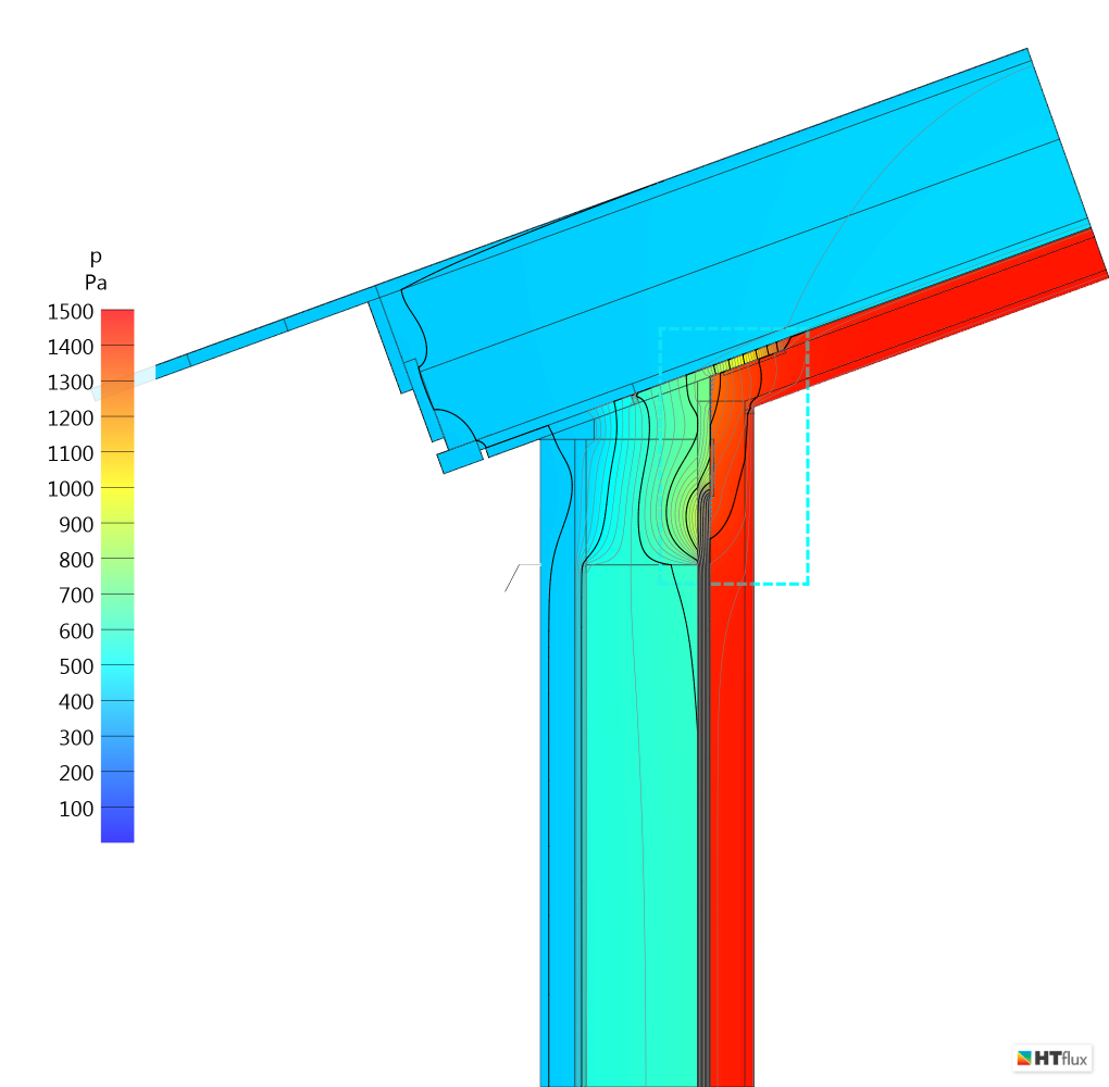 Wasserdampf-Partialdruckansicht – Glaser 2d – Traufendetail. Abrupter Übergang in der Dampfbremsen-Ebene.
