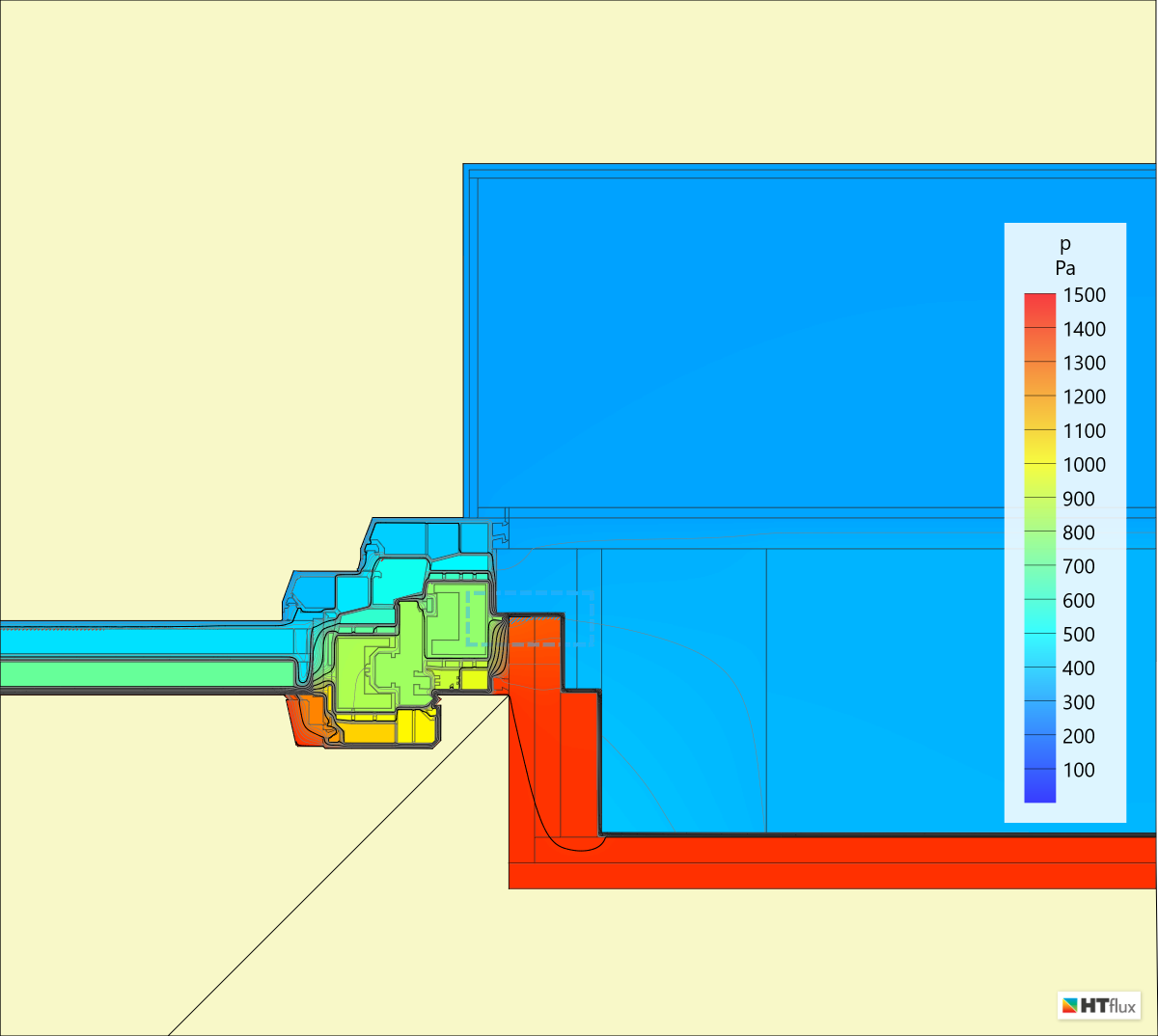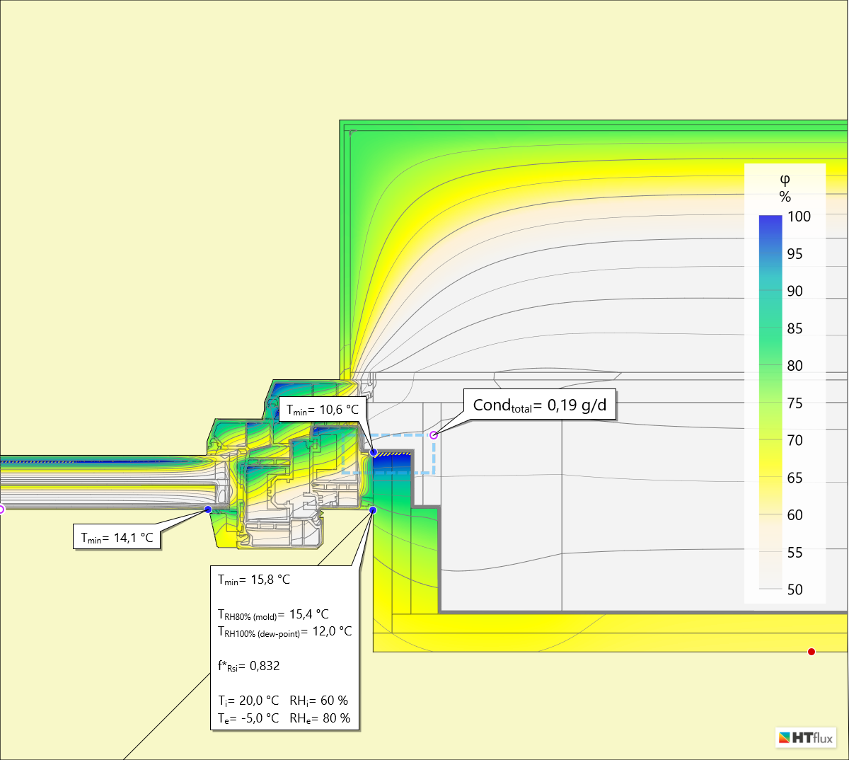 Die klimatischen Bedingungen können beliebig gesetzt werden. Je nach Aufgabenstellung orientieren sich diese an den entsprechenden Norm-Vorgaben oder den lokalen Gegebenheiten. Für diese Untersuchung wurde eine Außentemperatur von-5°C und eine Luftfeuchte von 80% gewählt. Das Innenklima wurde mit 20°C / 60% festgelegt. Entsprechend den Vorgaben von ISO 13788 wurde für den Fenster- und Rahmenbereich ein Wärmeübergangswiderstand von 0,13 m²K/W und für den Wandbereich von 0,25 m²K/W angesetzt.