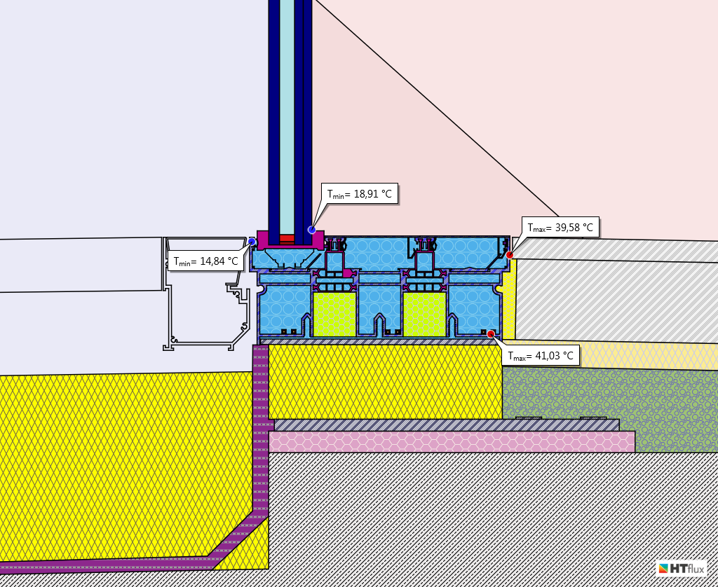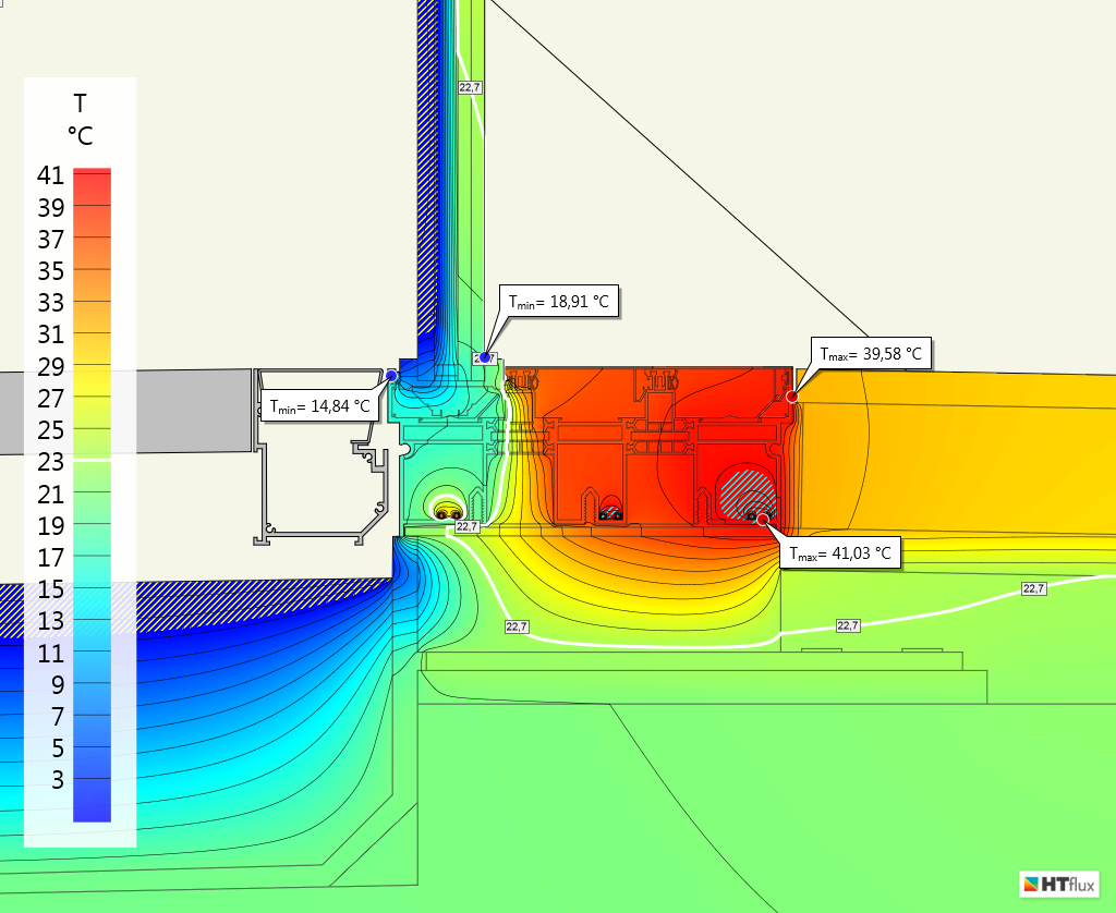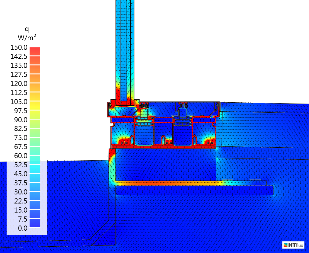 The following example demonstrates the possibilities of using the HTflux heat source feature. The task was to optimize a window frame heating for an indoor pool area. The aim of the heating cable design was firstly to avoid condensation at the floor section of the sliding door frame and secondly to prevent damage of the frame caused by freezing.